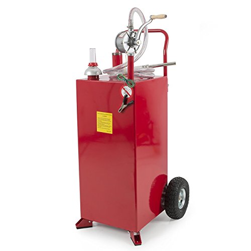 This 30 gallon gas caddy is perfect for storing fuel for automobiles, gas powered lawn and garden tools, motorcycles/ATVs and much more. The large capacity tank allows you to store up to 30 gallons of fuel and is easily transported with the built-in wheels. This caddy is safe for storing gasoline, diesel, kerosene and even biodiesel. Simply turn the hand pump forward or reverse for dispensing or siphoning fuel. The 8 foot hose with fill neck easily fits in any gas tank. This 30 gallon gas caddy is perfect for use at home, shop or on the go.